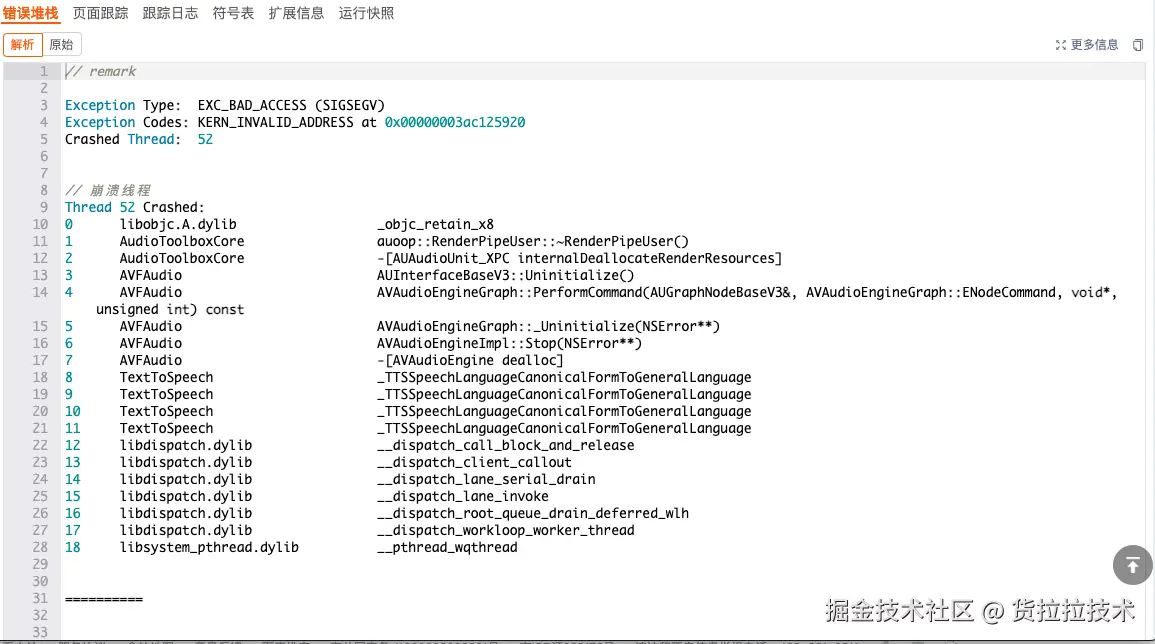 而从统计上看,iOS17.0 - iOS 17.2系统设备的司机每天活跃量每天差不多在1500上下,而这个崩溃每天崩溃量最多5-6个,也就表明很有可能只有在出现崩溃的时候,才会走[AVAudioEngine stop]和-[AVAudioEngine dealloc]方法,因此我对这两个方法进行hook,然后判断当前线程堆栈里面含有TextToSpeech文本,表明这是一个文本转语音相关调用,就进行埋点上报和写日志操作。