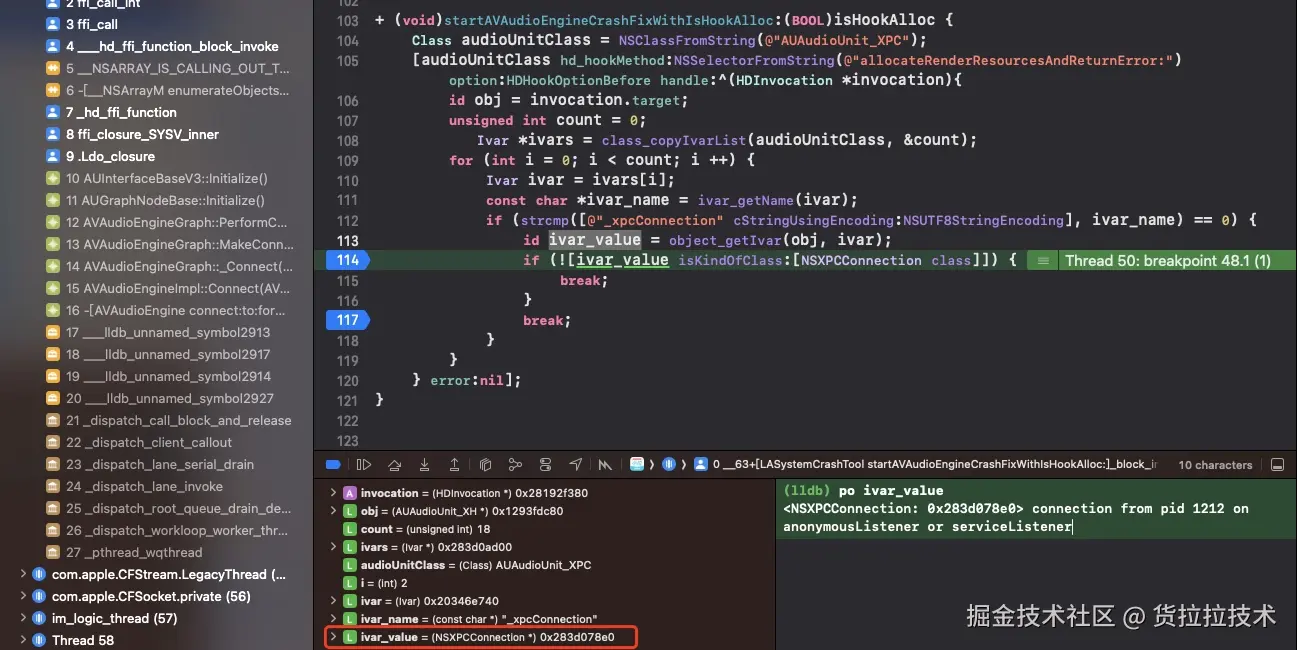 我们hook了AUAudioUnit_XPC的allocateRenderResourcesAndReturnError:方法,然后遍历AUAudioUnit_XPC实例里面的变量,找到_xpcConnection查看它的指针值,跟_renderPipeUser里面的指针值进行比较。