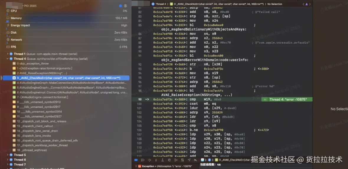 而从上面两个堆栈可以看到,-[AVAudioEngine dealloc]和-[AVAudioEngine stop]都会调用AVAudioEngineImpl::Stop(NSError**) + 396 (AVAudioEngine.mm:1081),调用都在子线程调用,