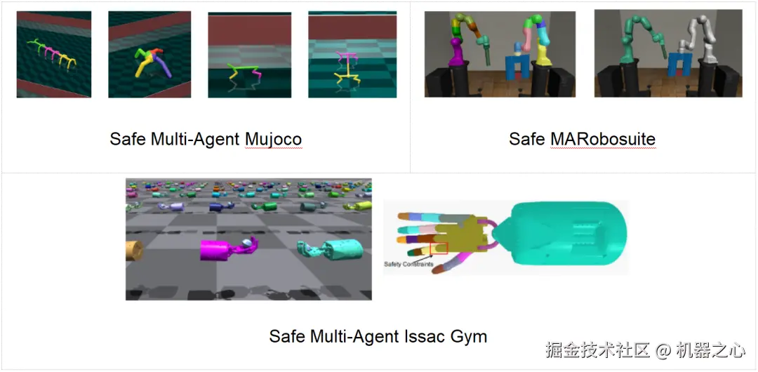 这是一个基于 MuJoCo 的多智能体安全强化学习基准。每个智能体控制机器人的一部分,并且必须共同学习如何操作机器人,同时避免碰撞到危险区域。这个基准环境非常适合评估多智能体系统中的协作和安全问题。