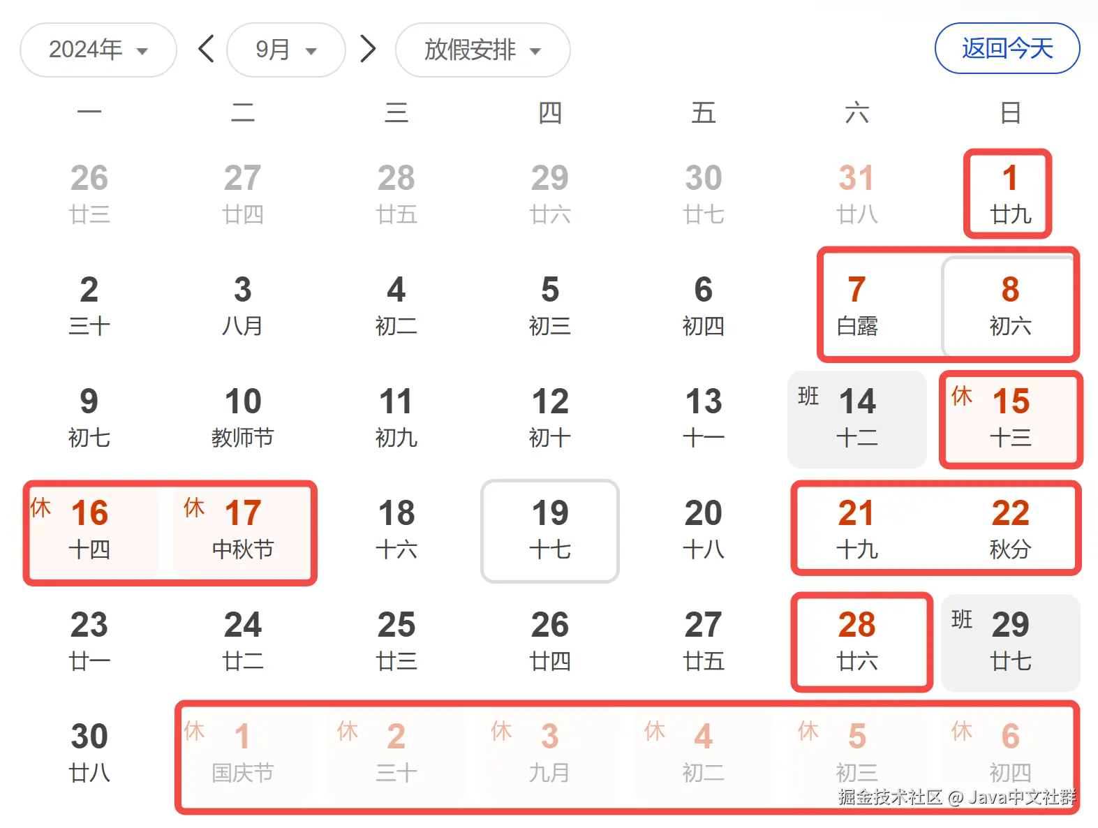 - 9~10 月份假期太多:9 月份假期就占了总时间的 1/3,这还不算国庆的 7 天假,假期绝大部分公司是不会进行招聘,如下图所示: