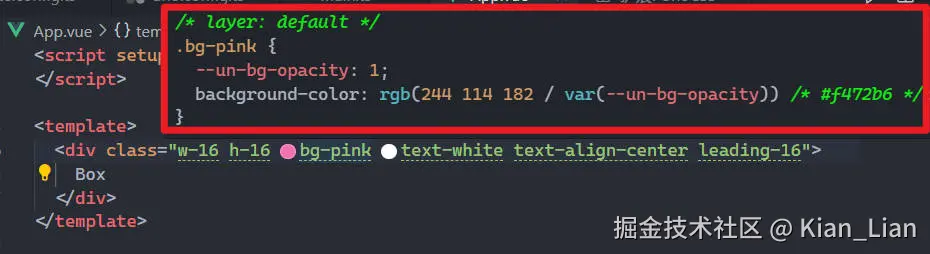 CSS 需要手动编写每个属性的值而UnoCSS只需要加上UnoCSS提供的对应类名就可以了😏