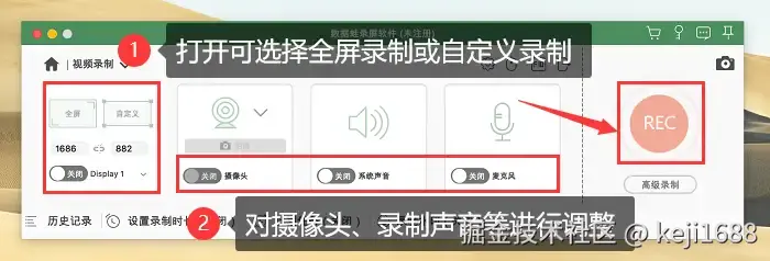 步骤2:在 【视频录制】 界面,我们可以设置录制参数,设置好视频录制的格式和质量等。还能自由调整录制的区域范围,开启或关闭麦克风和摄像头。然后点击 【REC】 录制按钮进行录屏。