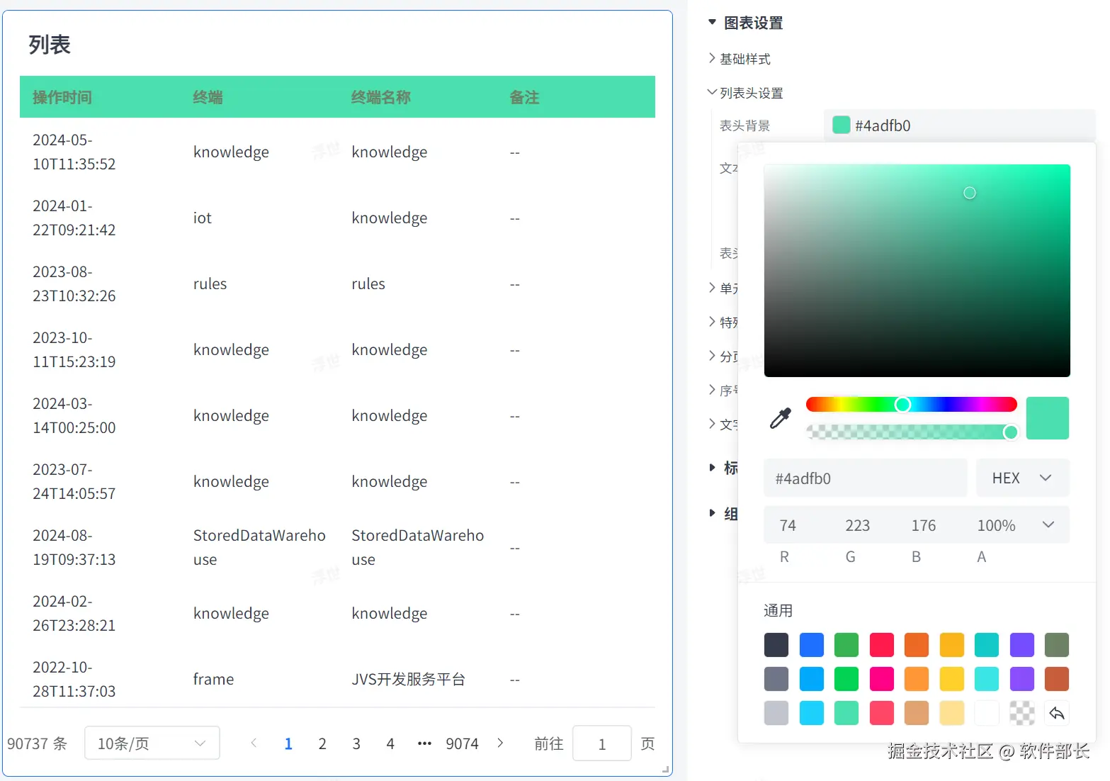 图表设置中包括:基础样式设置、列表头设置、单元格设置、特殊值设置、分页设置、序号设置、文本超长设置。