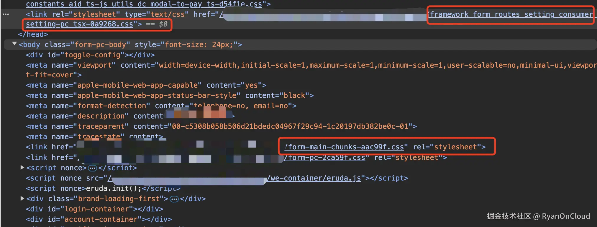 先后在Chrome、Safari、FireFox等诸多主流浏览器均进行了测试,得到的结果完全一致(form-root-wrap 样式优先级均大于 setting-root-wrap 样式优先级)。在Chrome Devtools 的 Elements 中尝试去搜索这两个CSS文件时却发现,framework_form_routes_setting-*.css 文件的所在位置与认知一致(在Head标签底部),而 form-main-chunk.css 文件却出现在了 body 标签中(HTML文档下载时form-main-chunk.css还在head标签中))。