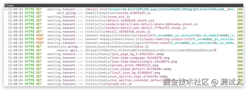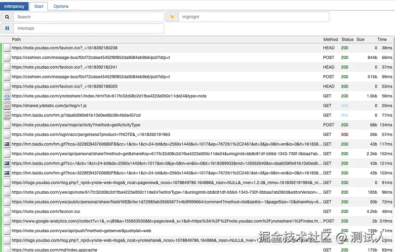 mitmweb启动。它和 Chrome 开发者工具中的 network 比较类似。下图为 mitmweb 启动后的效果图: