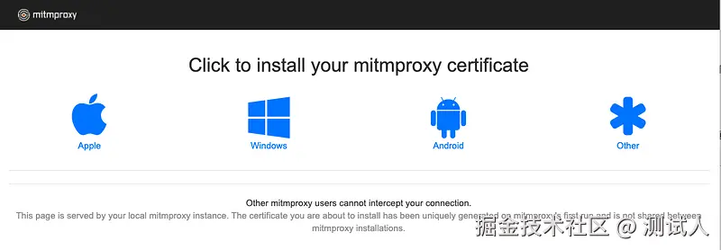 (3)在浏览器输入地址 mitm.it,显示效果如果和下图相同,证明前面的步骤都成功了 mitmporxy