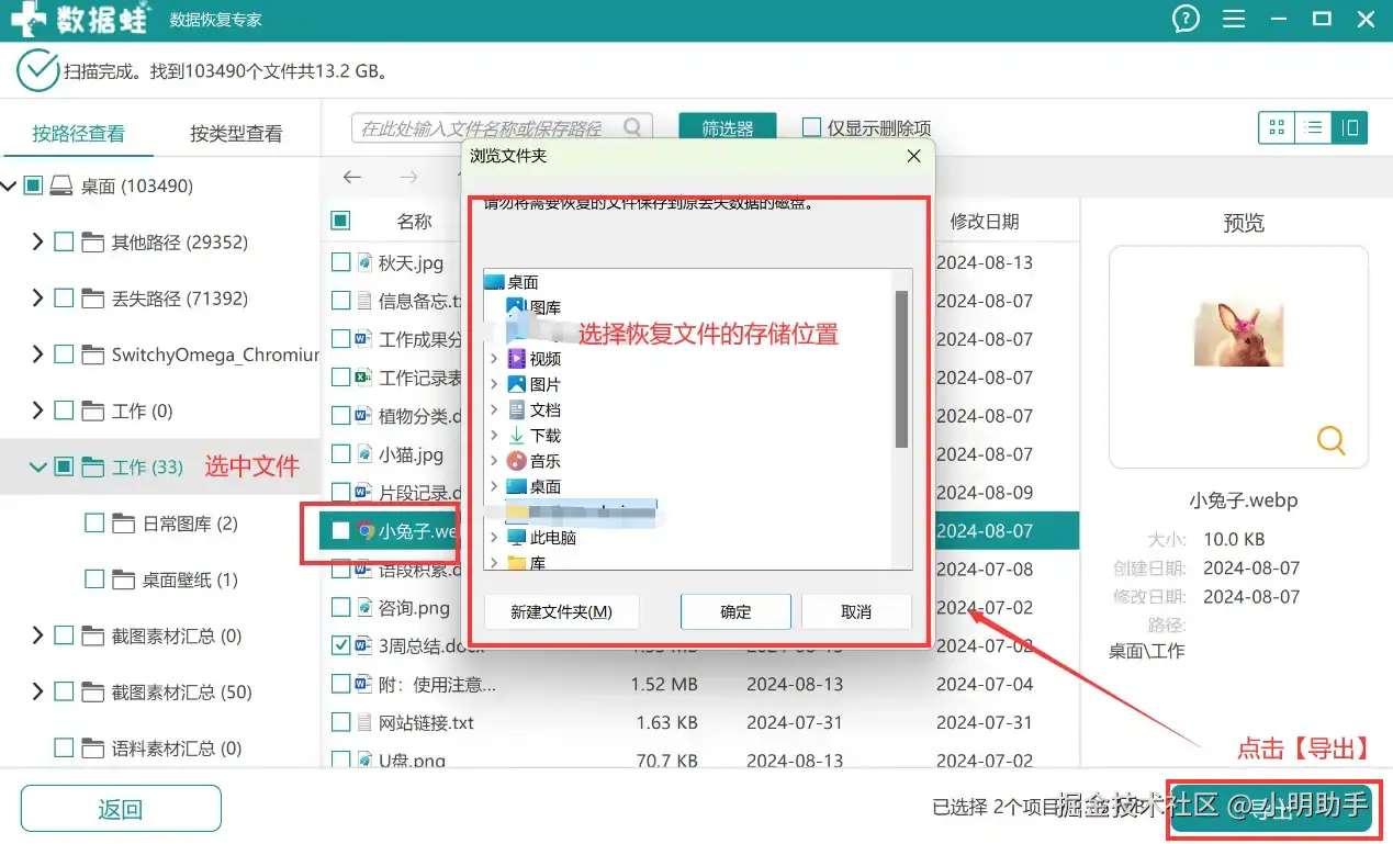 第3步: 选择需要恢复的文件后,点击【导出】,然后选择好恢复文件的存储位置。