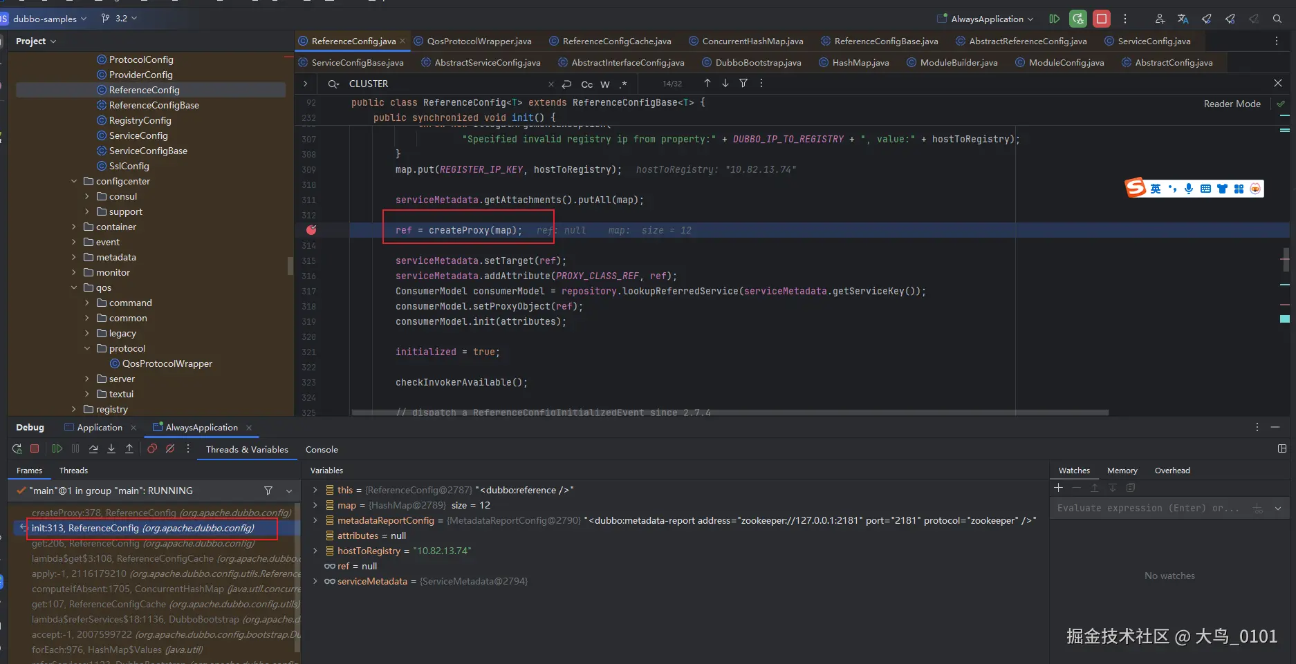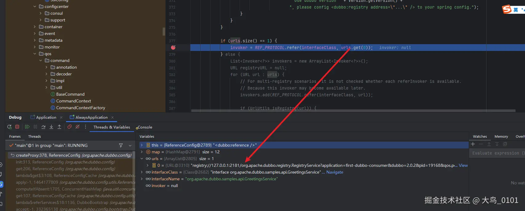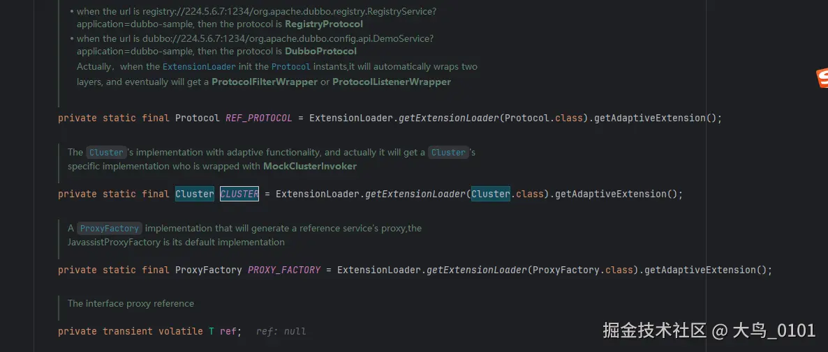 REF_PROTOCOL这个是AdaptiveExtension,他可以根据传参动态选择Protocol实现 那么他目前是哪一个实现呢?或者说他的源头Protocol实现是哪一个呢?来我们继续debug 看看他到底是啥东西?