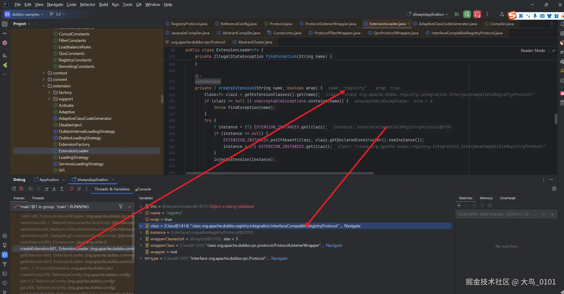 因为这个url是注册协议 ,所以会带上 getExtend("registry"),可以通过 org.apache.dubbo.common.extension.AdaptiveClassCodeGenerator#generateExtNameAssignment 这个来发现