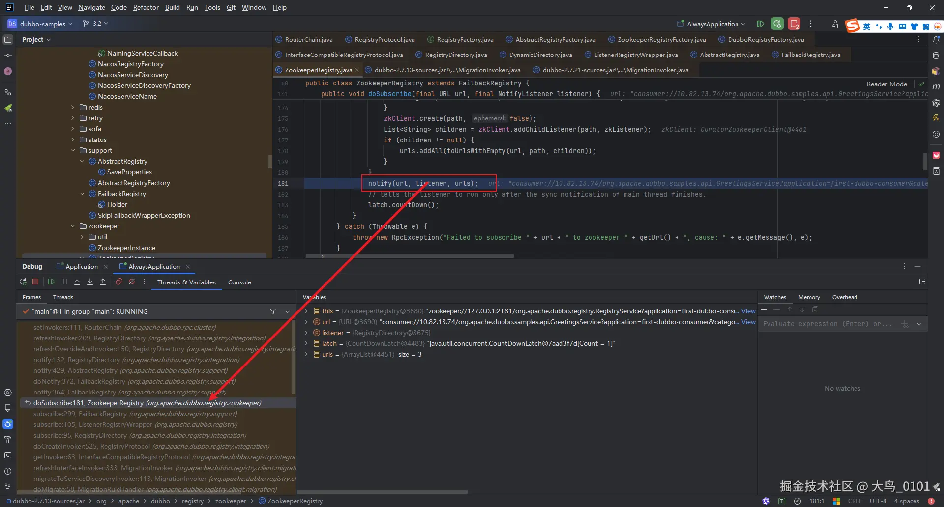 //创建zk监听这个监听实现最终也会调用 notify(url, listener, urls);