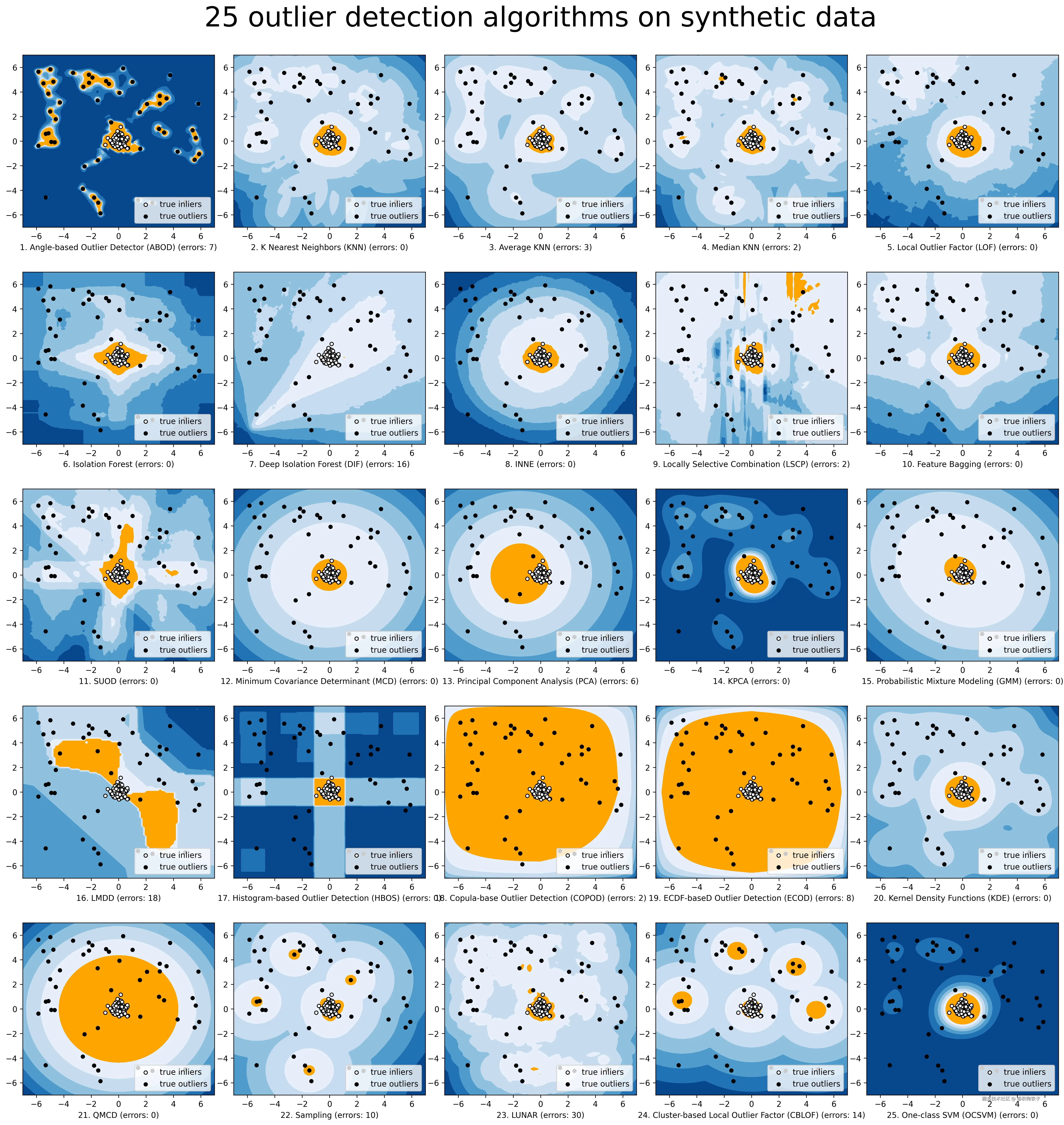 PyOD还提供了不同算法的基准比较结果,详见链接:benchmark。下图展示了各种算法的检测结果与实际结果,并标出了识别错误样本的数量:
