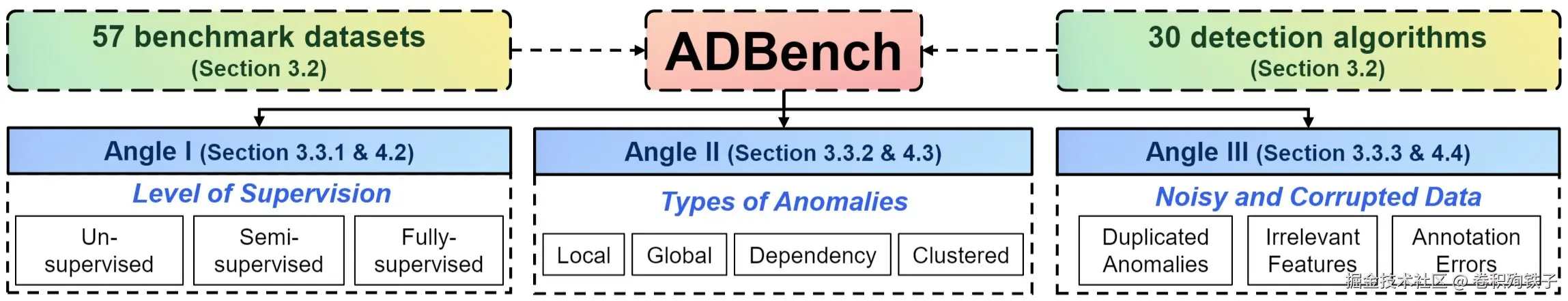 PyOD作者发布了一份长达45页的预印论文,名为ADBench: Anomaly Detection Benchmark,以及提供ADBench开源仓库对30种异常检测算法在57个基准数据集上的表现进行了比较。ADBench结构图如下所示: