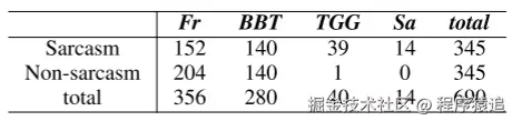 - MUStARD: 该数据集包含 690 个话语(345 个讽刺示例和 345 个非讽刺示例),这些话语源自著名电视节目,例如《老友记》、《生活大爆炸》、《黄金女郎》和《讽刺狂》。 实验数据集的详细统计数据如表一所示。