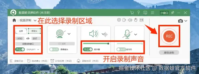 步骤2: 点击视频录制后可以看到以下画面,可以根据自身录制需求选择录制的画面范围,并开启录制的声音等。设置完成后点击 “REC” 录制按钮进行录屏。