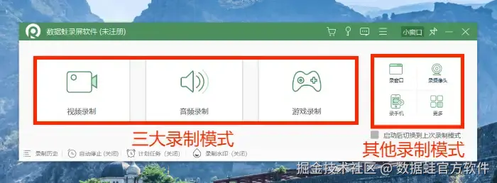 步骤1: 首先打开数据 蛙软件,即可看到以下画面。可以根据自身的需求选择视频录制、音频录制、或者游戏录制,还可以选择关闭水印。本篇文章以 “视频录制” 为例。