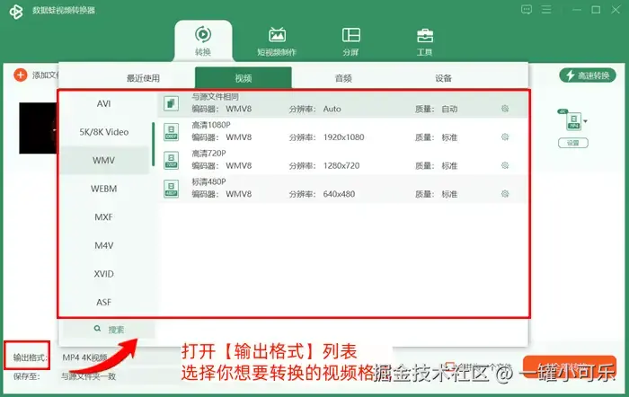 步骤2:打开 【输出格式】 列表,选择你需要转换的视频格式,如WMV格式。
