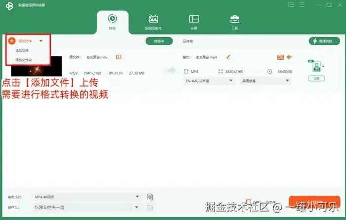 步骤1:在视频格式转换界面,点击 【添加文件】 上传视频。