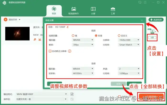 步骤3:如果你有自定义格式参数的需要,可以点击 【设置】 ,输入想要的视频格式参数。调整完成后,点击 【全部转换】 。