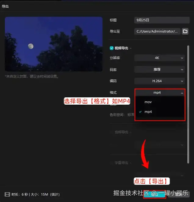 步骤2:在视频导出选项下,选择导出【格式】如MP4,点击【导出】即可。