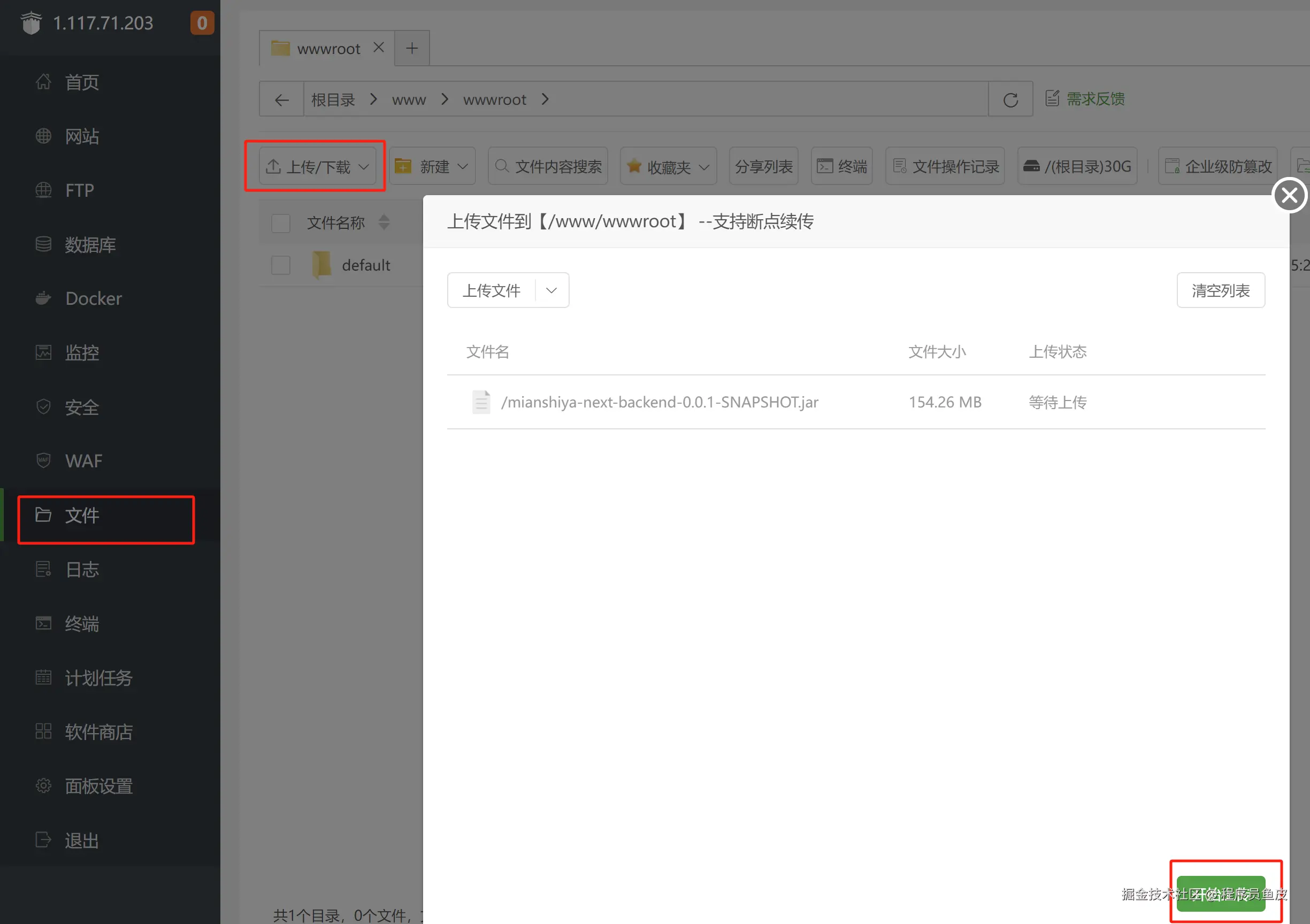 打包成功,得到 jar 包文件,需要上传 jar 包到服务器: