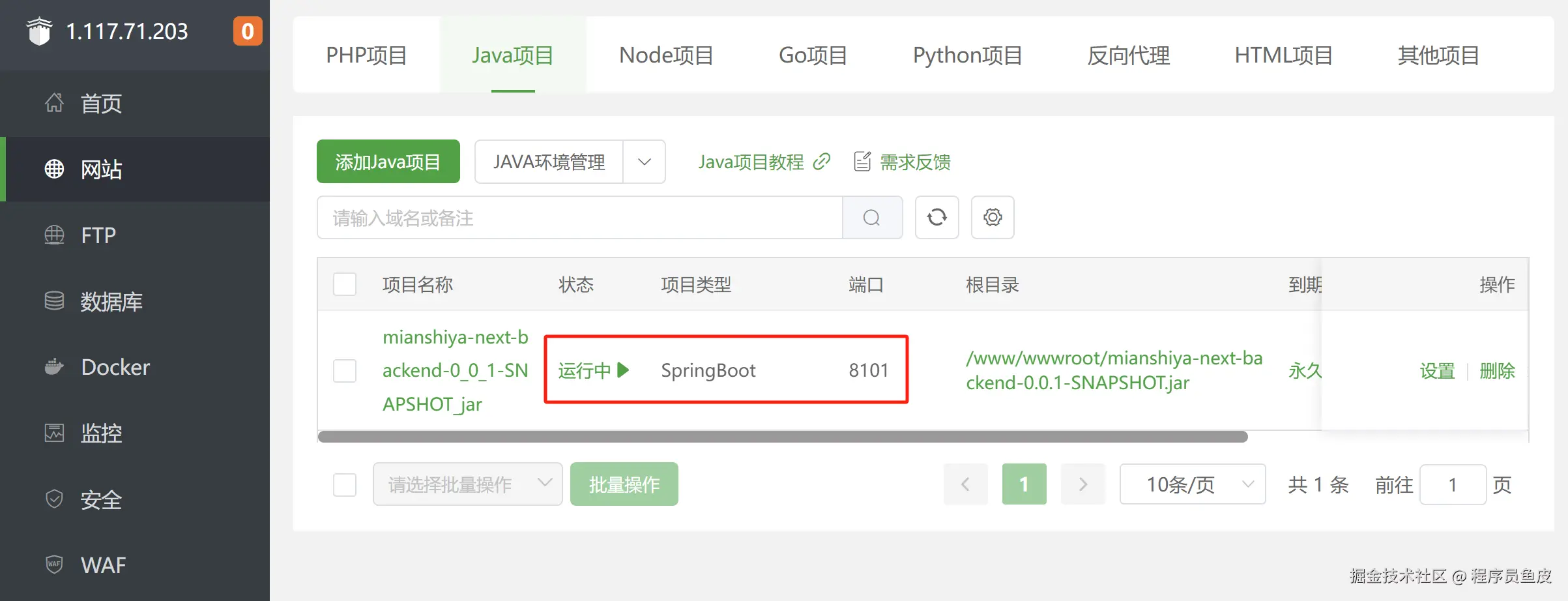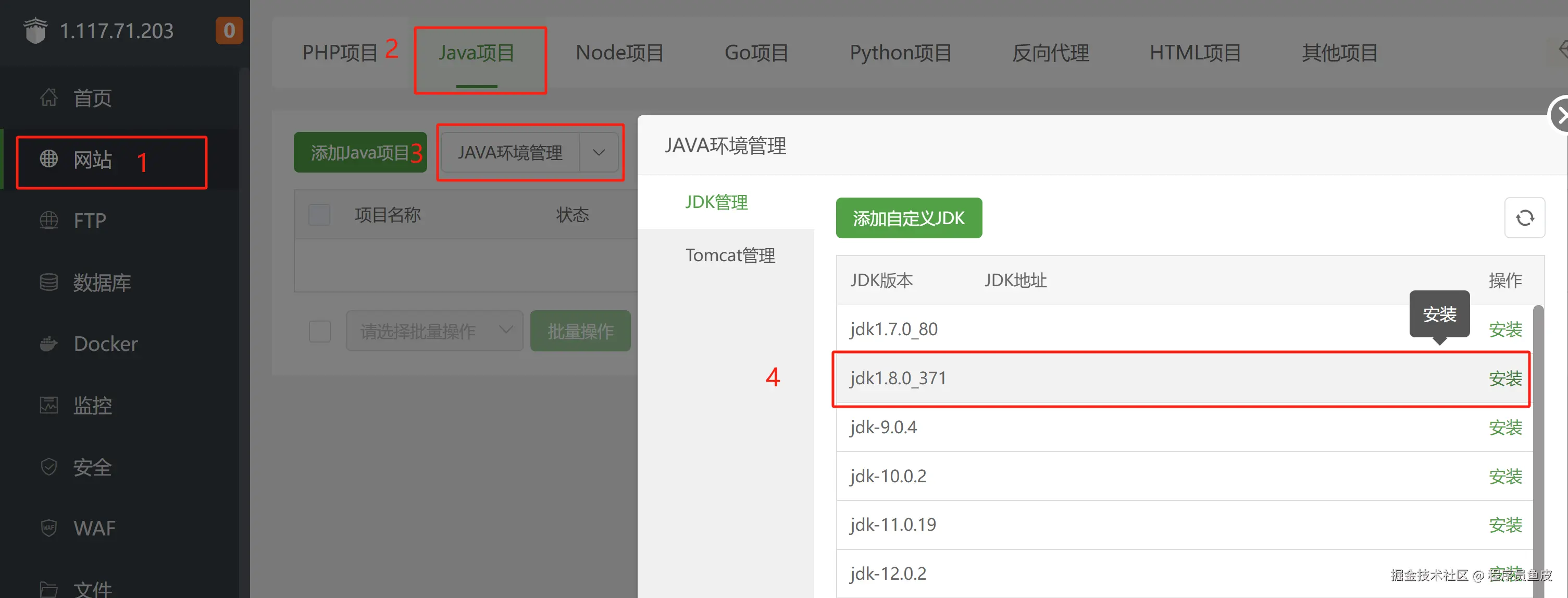 要部署 Java 项目,必须安装 JDK。在宝塔面板中,可以通过下图的方式快速安装指定版本的 JDK。