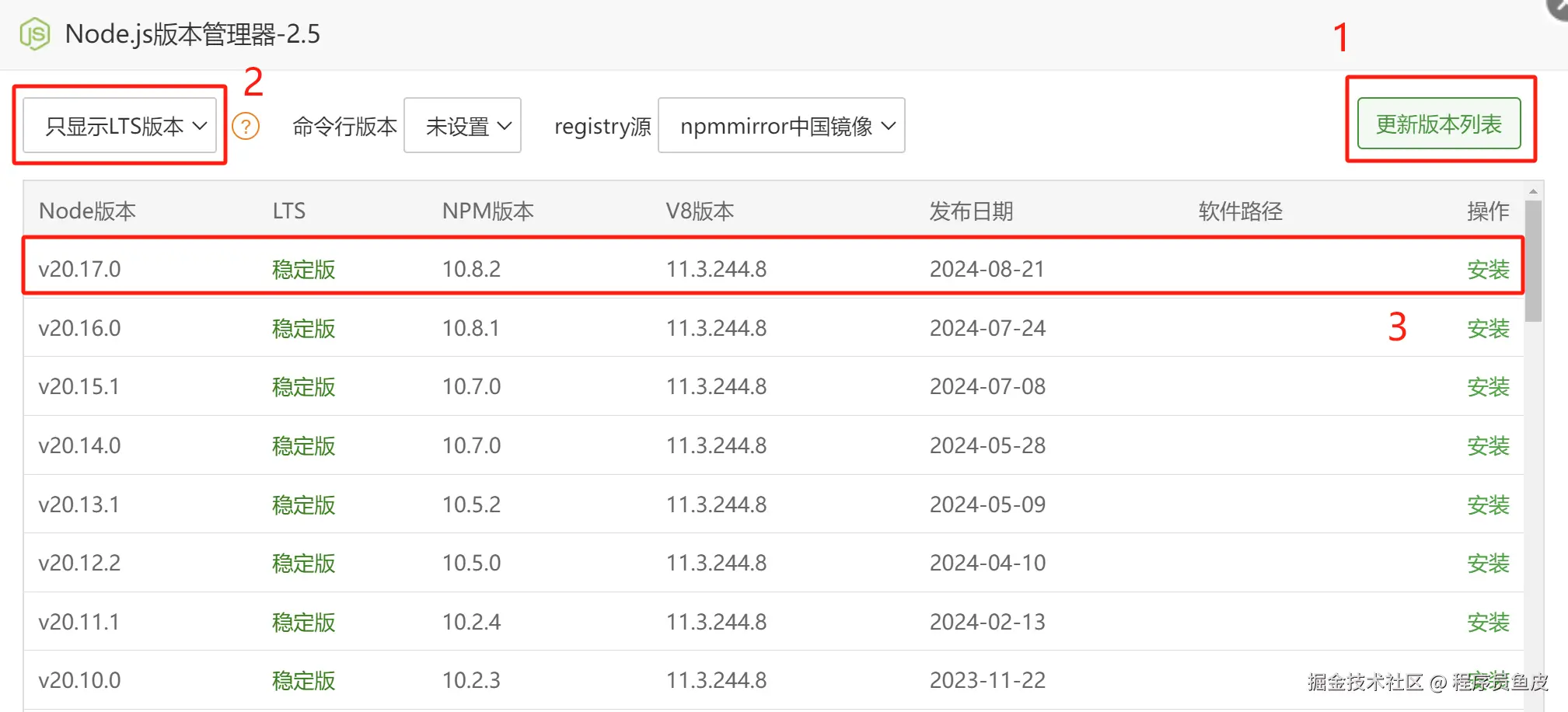 然后就可以用它来安装 Node.js 版本了,首先要更新版本列表,然后选择 > 18.18.x 的稳定版本,此处鱼皮选择 v20.17.0 安装: