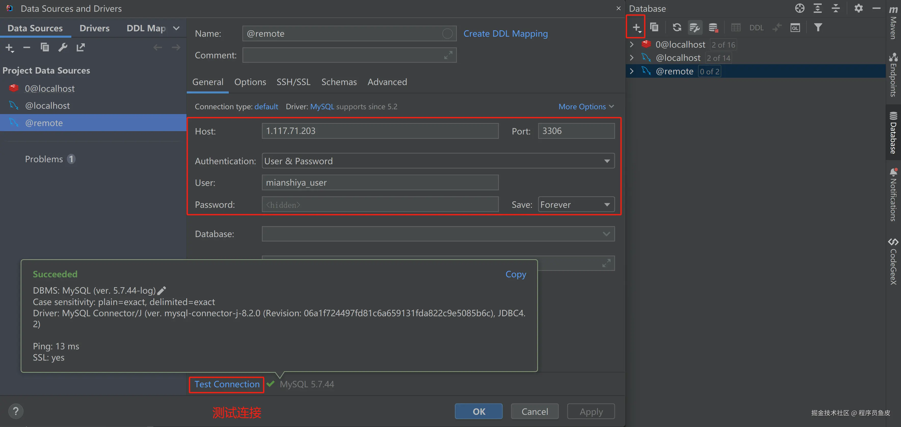 在 IDEA 中打开后端项目,通过数据库面板在本地检查连接是否正常: