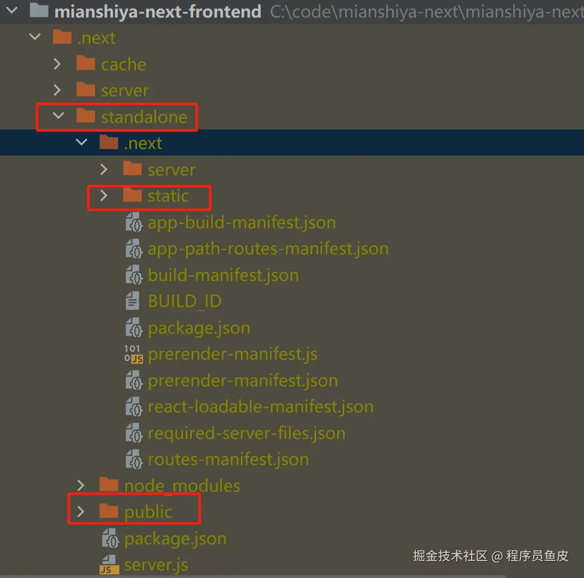 然后在 .next 目录下会生成 standalone 目录,该目录就是可以独立部署的前端包。但是必须按照如下模式组织目录,一定不能有错!