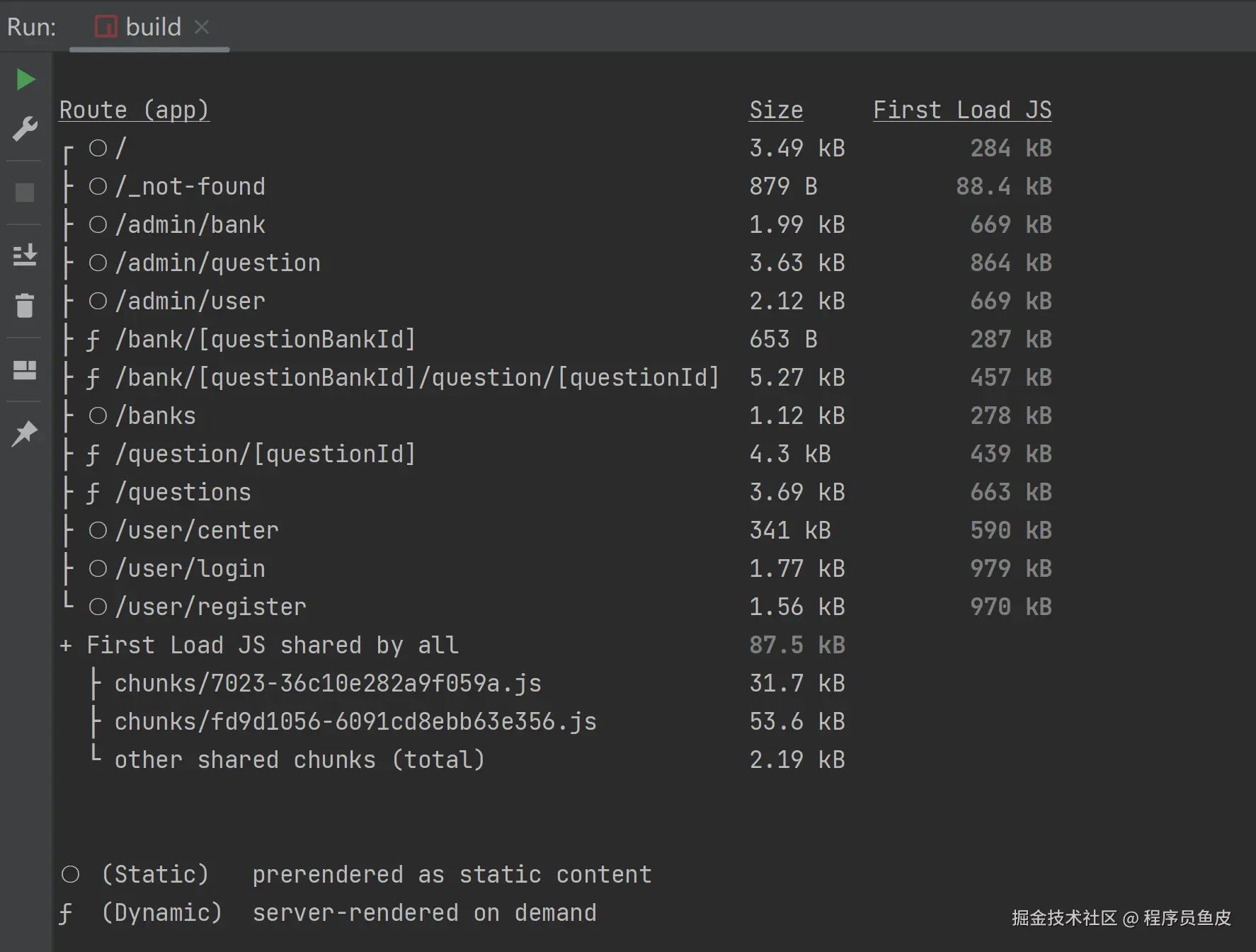打包成功后,看到下图信息,能够很直观地看到哪些页面用到了静态渲染和服务端渲染: