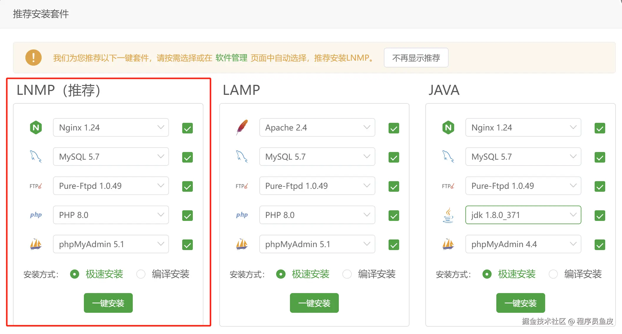 访问宝塔面板,首次进入宝塔时,会提示我们安装环境,这里推荐安装 LNMP(包含 Nginx 服务器),适合部署前后端分离的项目:
