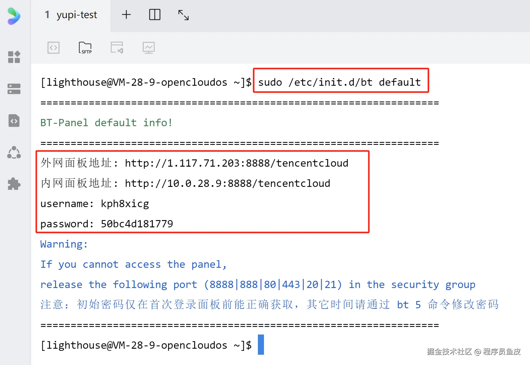 点击登录后,进入到 web 终端,复制脚本并执行,会得到初始账号密码和面板地址: