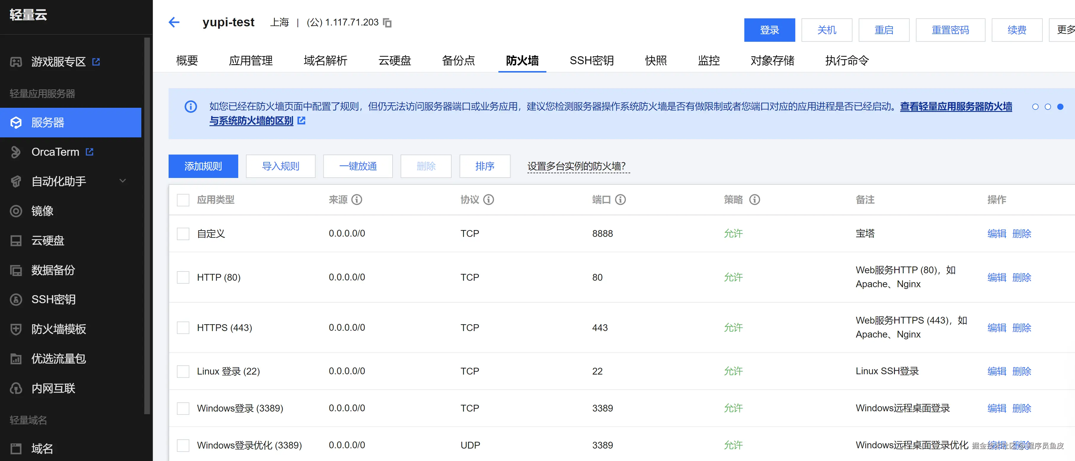 购买好服务器后,进入服务器详情页,在防火墙标签页中放通 8888 宝塔面板端口,否则无法在自己的电脑上访问宝塔。