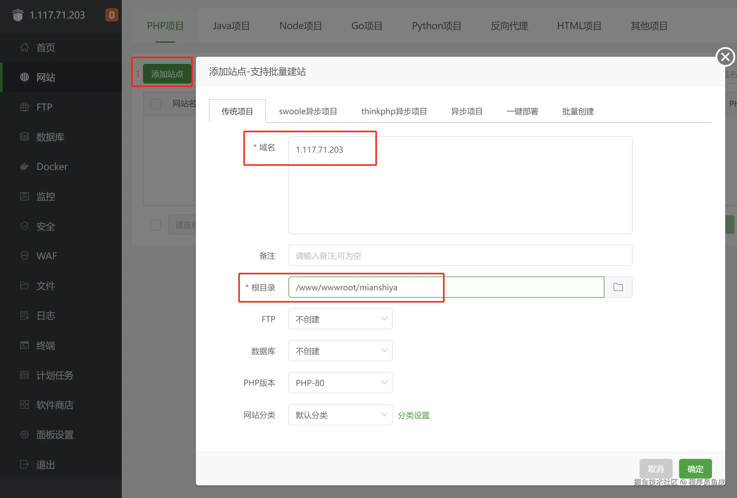 新建一个站点(Nginx),域名填写当前服务器 IP 或者自己的域名,根目录随意填写即可。