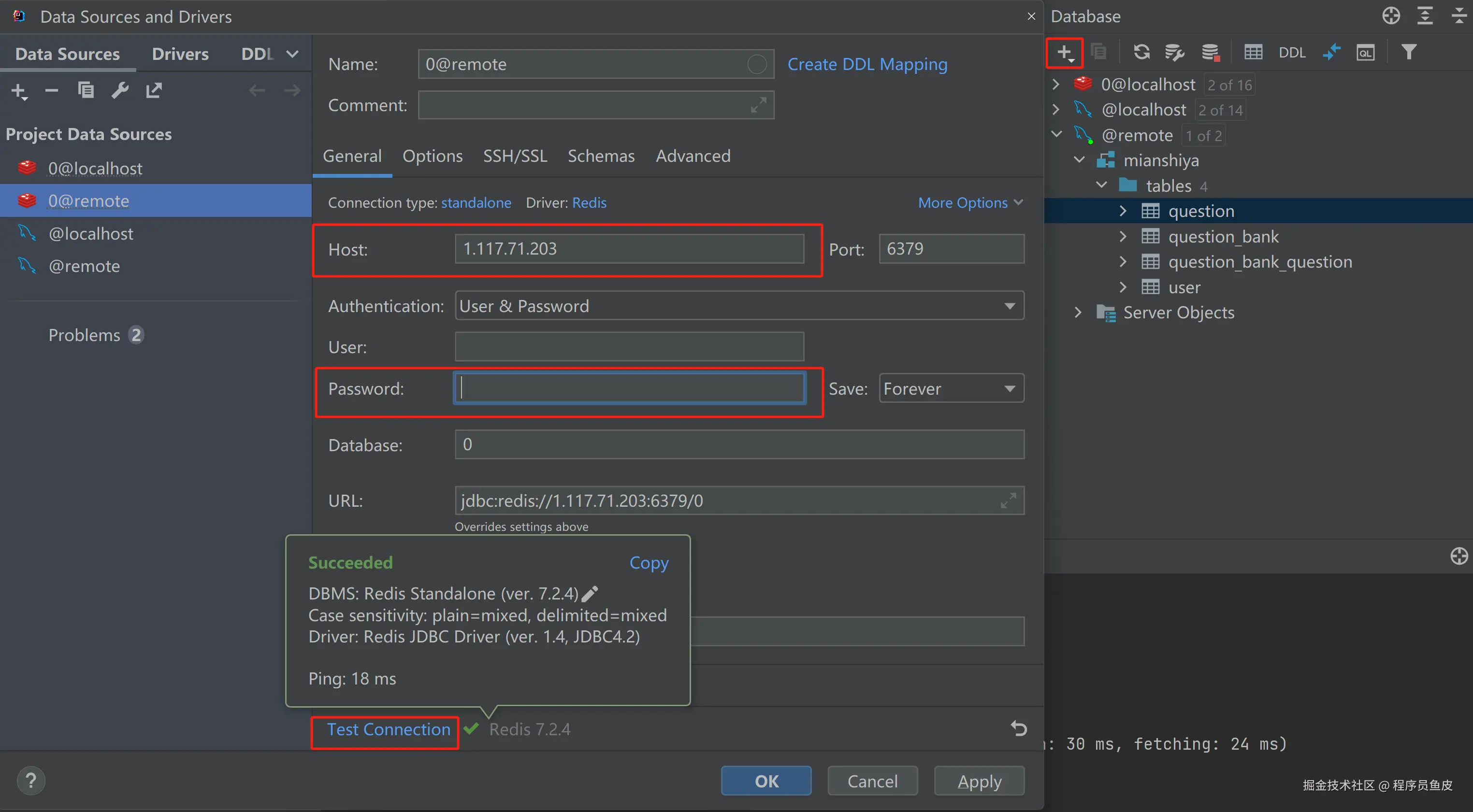 修改配置后,一定要重载配置。最后,在 IDEA 数据库面板中验证本地能否连接远程 Redis: