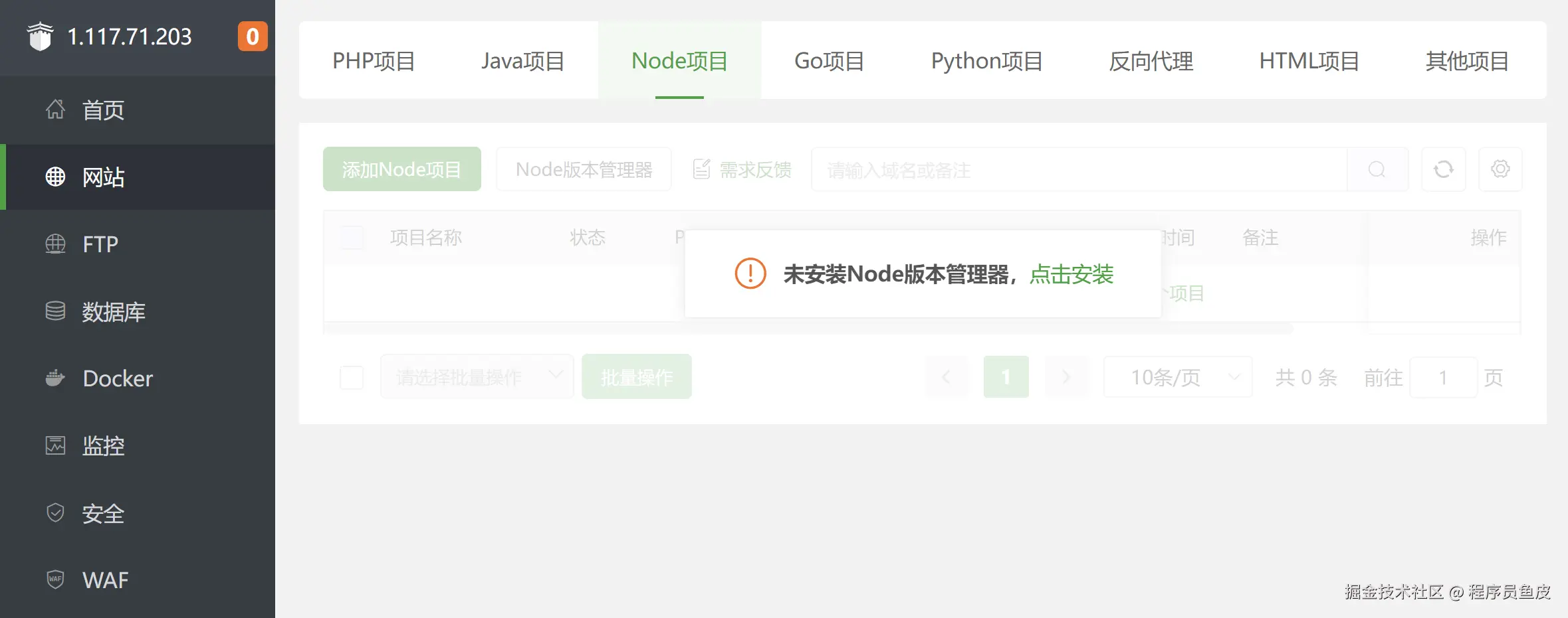 进入宝塔面板 - 网站 - Node 项目,会提示安装 Node 版本管理器,点击安装:
