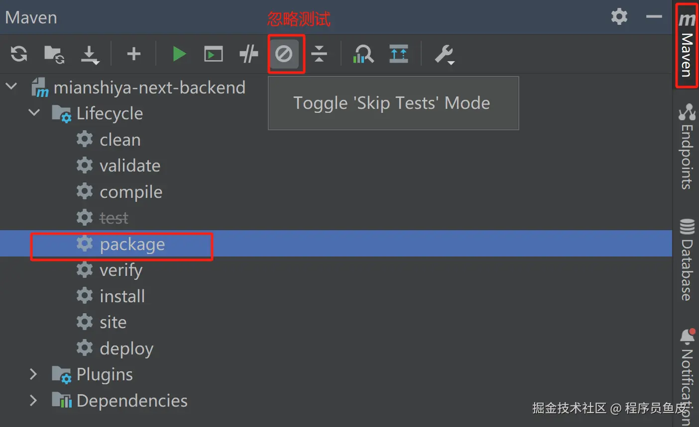 在 IDEA 中打开后端项目,忽略测试并打包: