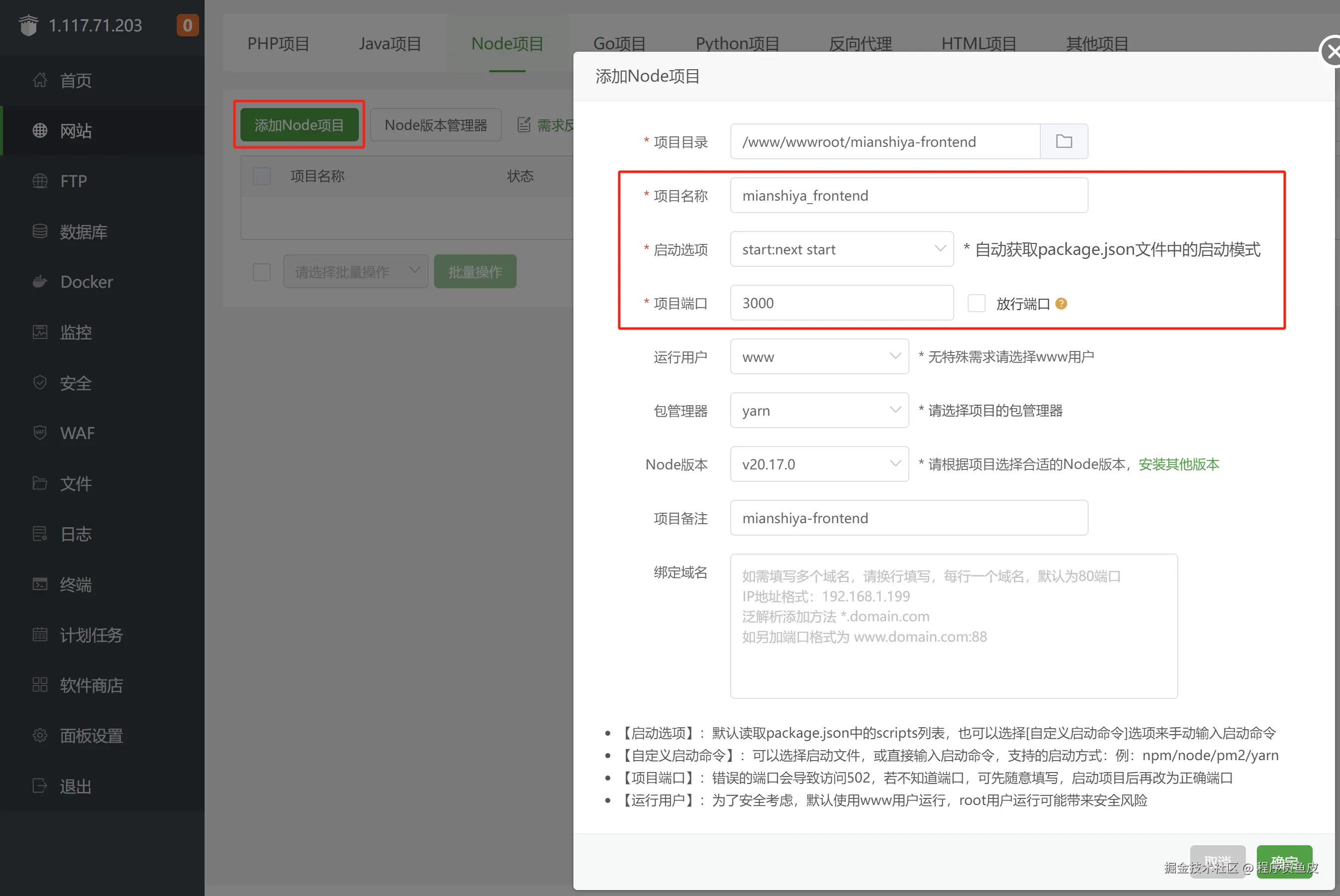 上传到服务器后,添加 Node 项目。注意修改启动选项(start 或者自定义命令 node server.js)和项目端口(3000):