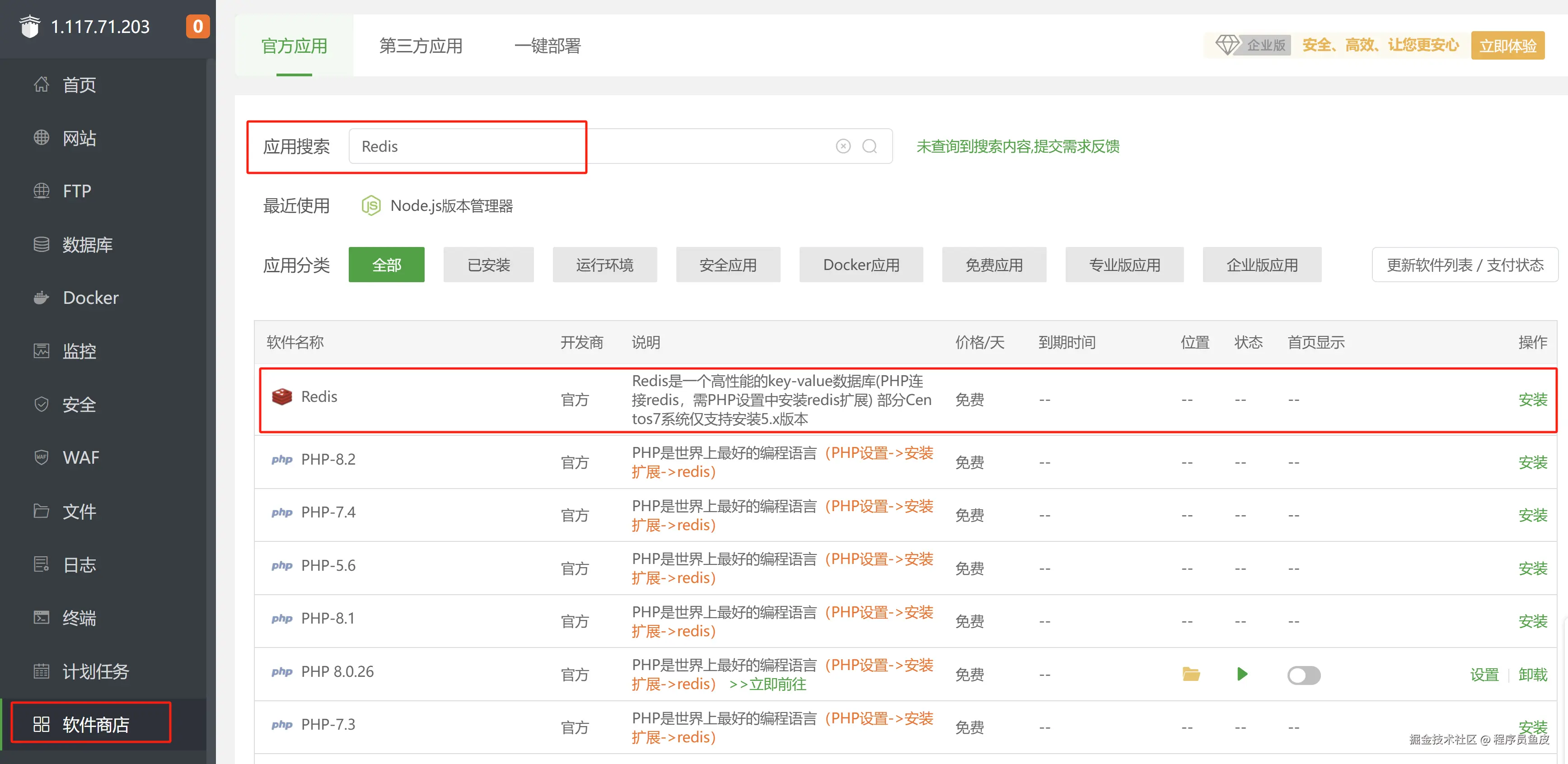在宝塔面板的软件商店中,搜索并安装 Redis,版本选择默认的即可: