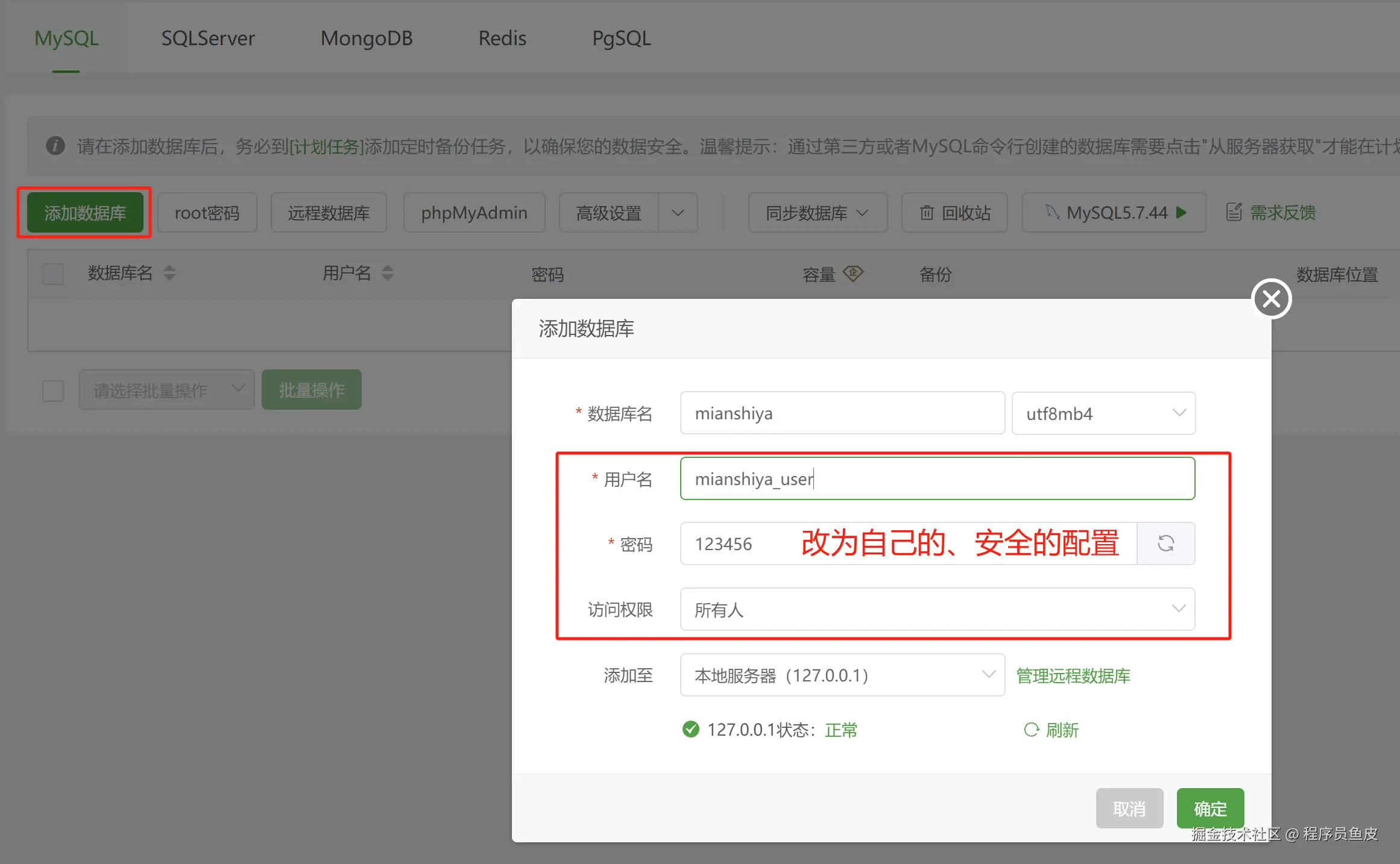 先为后端项目添加一个数据库。数据库名称和我们项目需要的数据库名称保持一致(此处为 mianshiya),注意用户名、密码和访问权限: