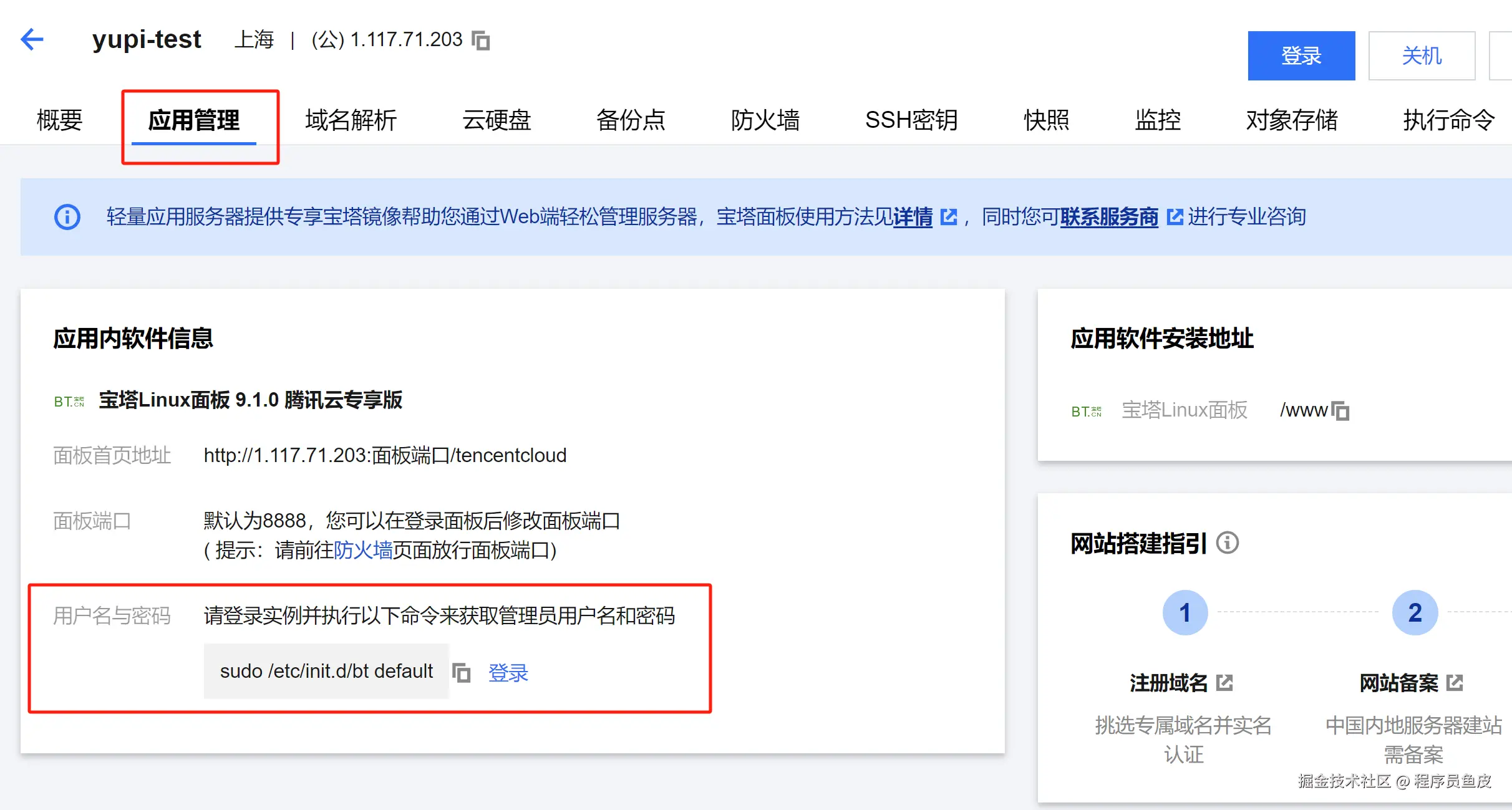 进入应用管理标签页,登录宝塔。首次登录时,需要先登录服务器,通过输入命令的方式获取宝塔默认账号密码,如图: