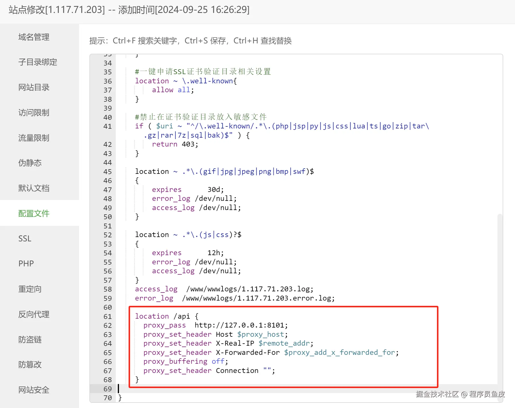 如果访问的是后端接口(地址有 /api 前缀),则 Nginx 将请求转发到后端服务,修改 Nginx 配置如图: