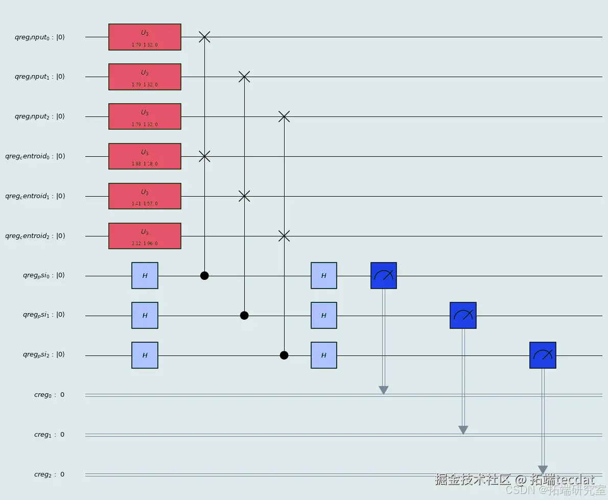 - 在步骤 1 结束时,已经在不同寄存器中相干地估计了数据集中每个点与 k 个质心之间的平方距离。由于平方是单调函数,不需要计算距离的平方根即可找到距离每个数据点最近的质心索引。