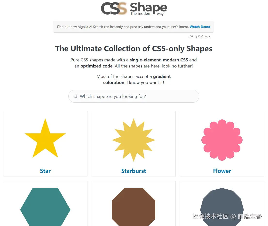 CSS Shapes 允许你使用各种形状来创建更有趣的网页布局。这个工具提供了各种形状的示例和代码,帮助你快速掌握 CSS Shapes 的用法。