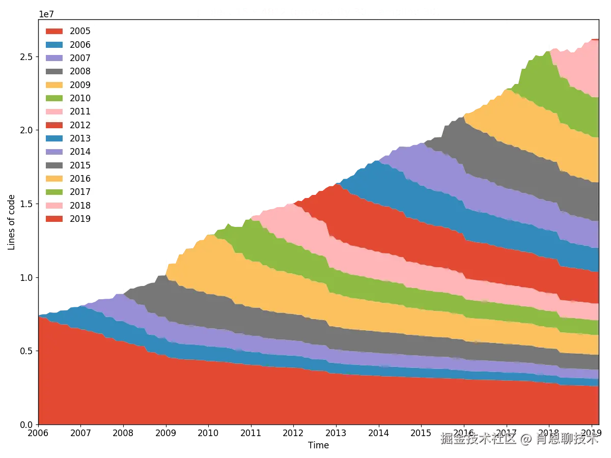 代码的 “半衰期”,衡量项目中不变的代码占比变化情况,半衰期越长的项目越稳定。Hercules是一个用Go语言编写的快速且高度可定制的Git历史分析引擎,支持多种内置分析和插件系统,可以用于生成代码的“半衰期”图。
