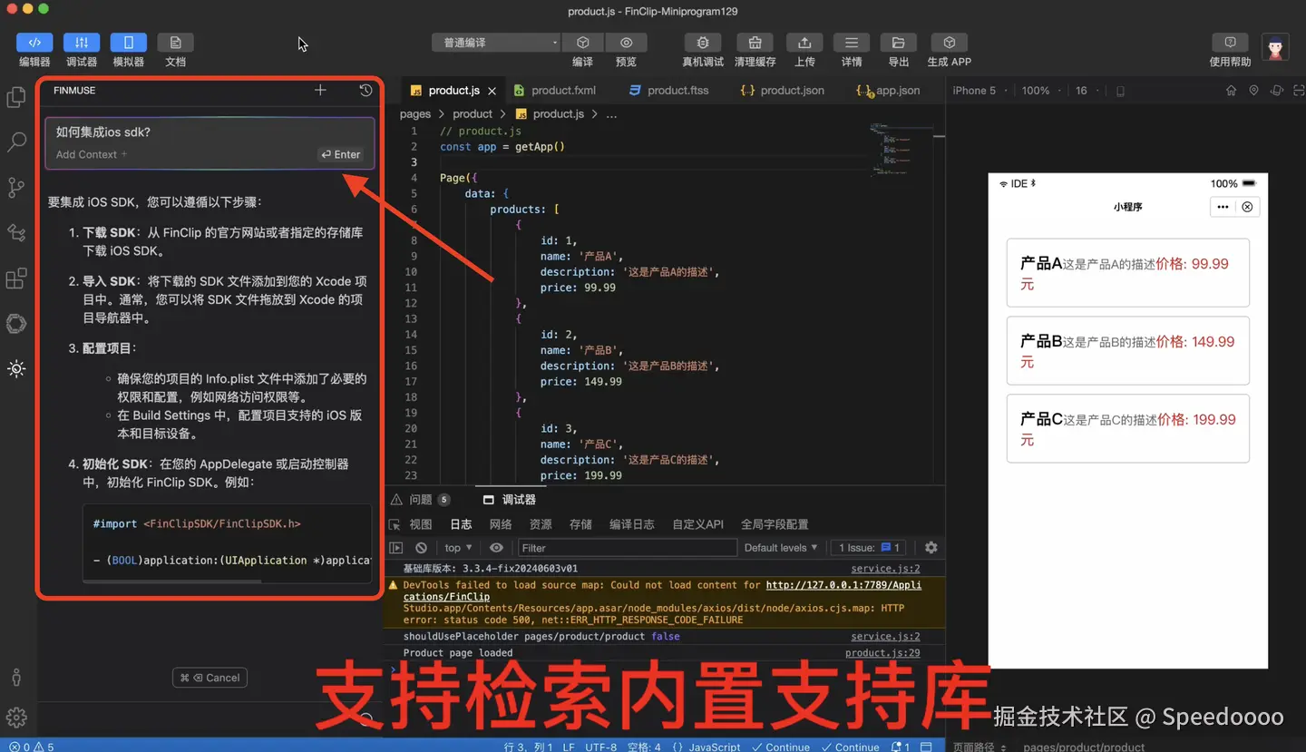 其他有趣的功能,就是对于一个小程序开发小白来说,很有可能就连小程序开发语法和技术都不熟练,如何能够基于产品已有的开发文档,更便捷的进行知识提取,FinClip也通过一个AI agent连通了自有的小程序开发的知识连起来,让使用的开发者能够更好的对开发知识进行检索。