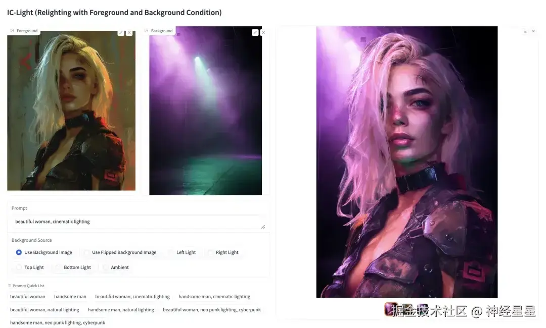 IC-Light 是一个旨在通过机器学习模型实现图像重新照明的项目,全称为 Imposing Consistent Light。