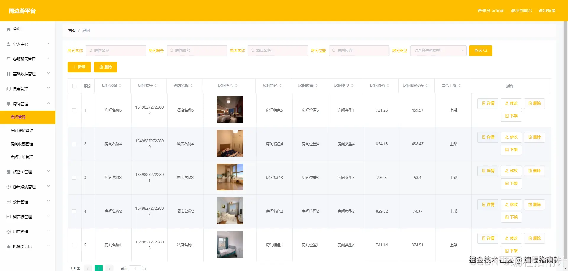 管理员进入如图3-4所示的房间管理界面之后,管理员点击信息显示栏中最右侧的修改,删除,下架按钮可依次完成房间信息的修改,删除,下架等操作,在本界面,管理员也能新增房间信息。