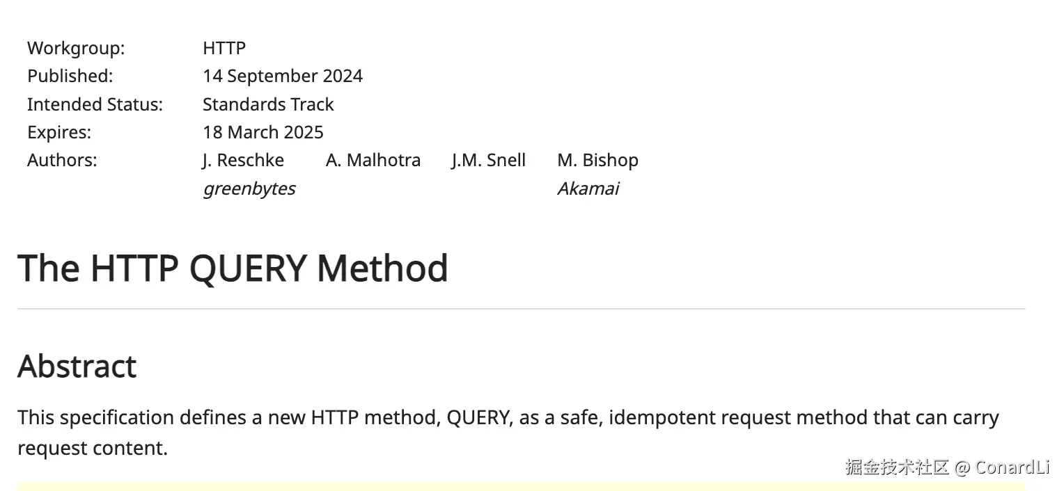 为了弥补这些不足,HTTP 工作组提出了一种新的方法——QUERY,该方法既能承载大量请求数据,又能保证请求的幂等性和安全性。