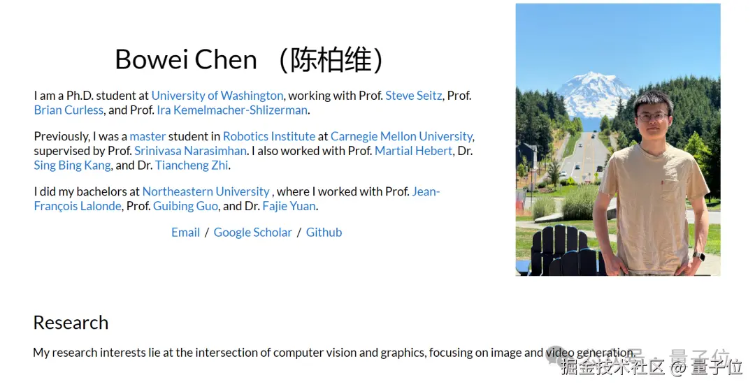 Bowei Chen (陈柏维),本科就读于国内东北大学软件工程专业(2016 年入学),后分别在卡内基梅隆大学机器人研究所和华盛顿大学攻读硕博。